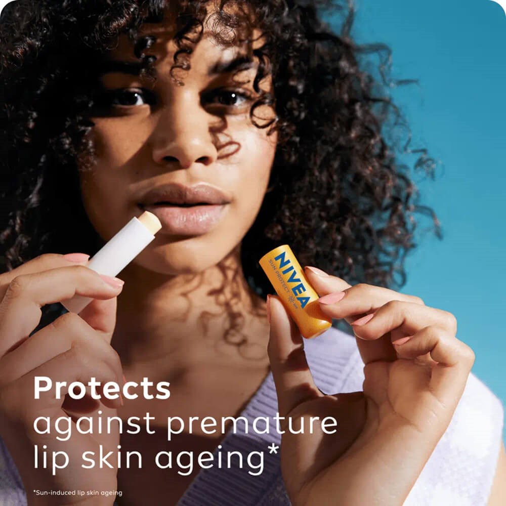 NIVEA Ultra Care & Protection SPF50 Lip Balm cares for your lips in more ways than one by providing long lasting moisture as well as SPF50 protection against UVA and UVB rays and the harmful effects of the sun. With natural oils and shea butter, Ultra Care has a pleasant texture that instantly melts into your lips and keeps them moisturised for 24 hours*. Enjoy happy moments outside in the sun with smooth and protected lips. Make sure to reapply the lip balm frequently, especially after eating, swimming or toweling. The skin compatibility of this lip balm with SPF 50 has been dermatologically approved. *clinically tested.