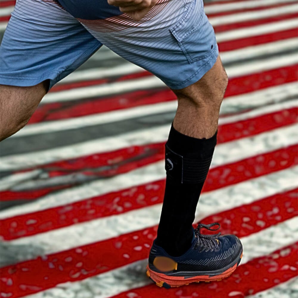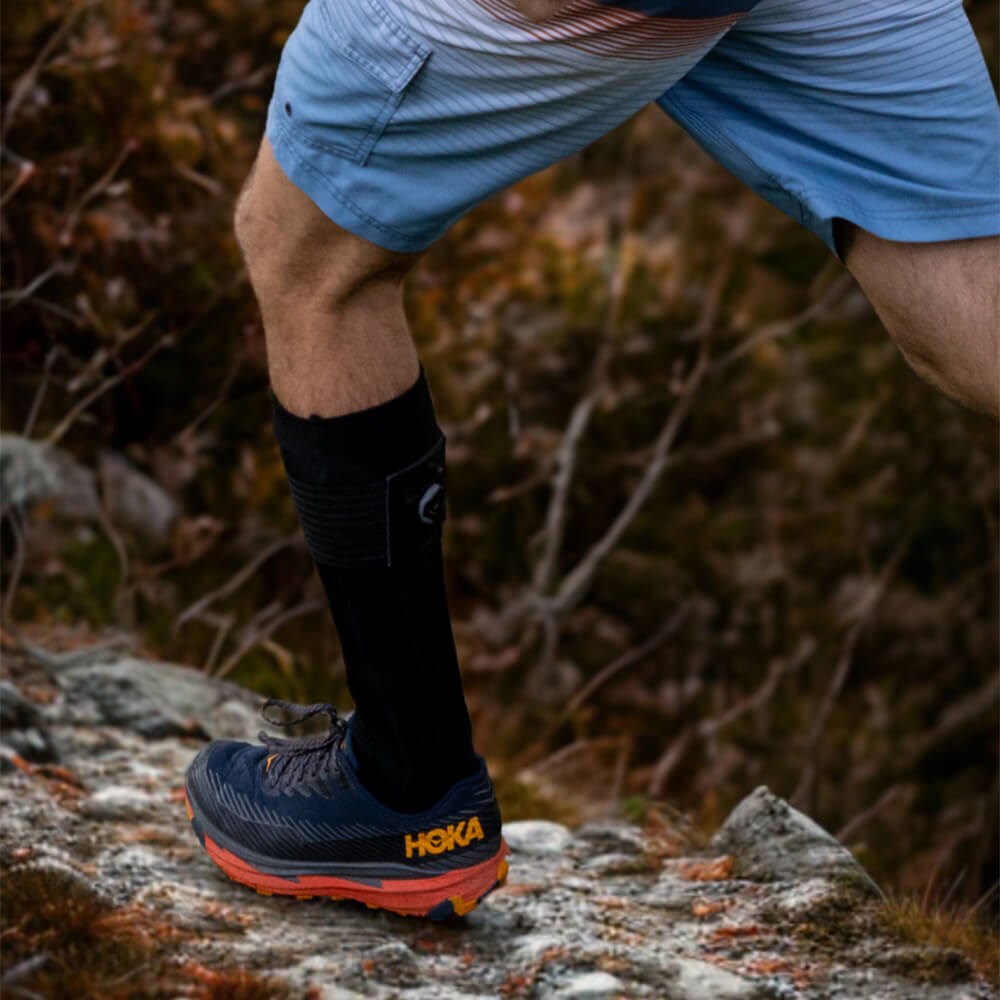 The Orthopaedic Sleeve functions like an exoskeleton for the posterior distal limb, lifting the heel by an adjustable tension dial. This design was aimed at mimicking natural walking patterns and redistribute workload from pathological tissue. UQ Biomechanics Lab testing validates a decrease in EMG signal to triceps surae, Achilles tendon tension, anterior ankle compression and heel contact time. We propose that this mechanism represents a relative decrease in applied workload to injured tissues and we aim to assist facilitating normalised movement patterns, decrease kinesiophobia, and assist with adherence to increase activity, exercise intervention or progression.