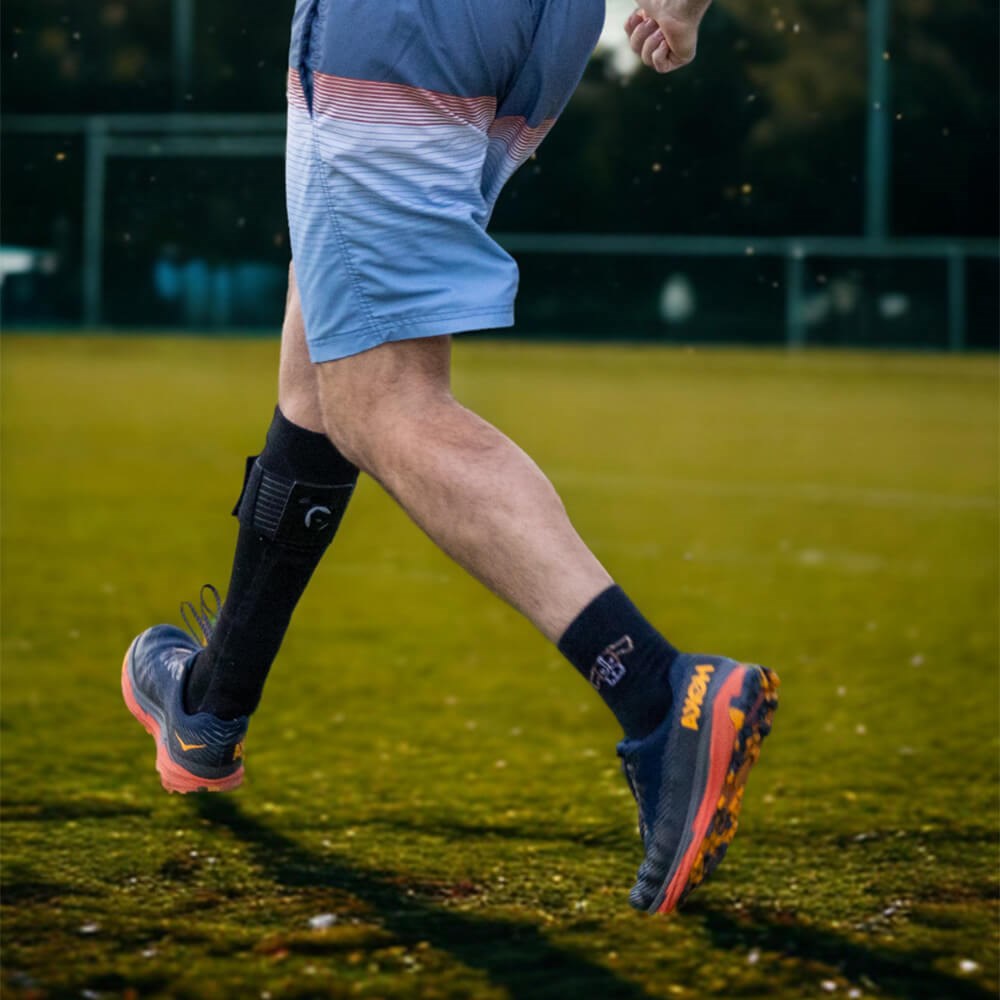 An easy to use compression style high-sock brace. With a deliberately unique design, customisable through a turn to tighten dial mechanism, this brace allows for easy and immediate adjustments to cater to all levels of pain.
