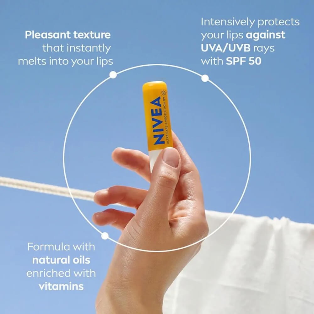 NIVEA Ultra Care & Protection SPF50 Lip Balm cares for your lips in more ways than one by providing long lasting moisture as well as SPF50 protection against UVA and UVB rays and the harmful effects of the sun. With natural oils and shea butter, Ultra Care has a pleasant texture that instantly melts into your lips and keeps them moisturised for 24 hours*. Enjoy happy moments outside in the sun with smooth and protected lips. Make sure to reapply the lip balm frequently, especially after eating, swimming or toweling. The skin compatibility of this lip balm with SPF 50 has been dermatologically approved. *clinically tested.