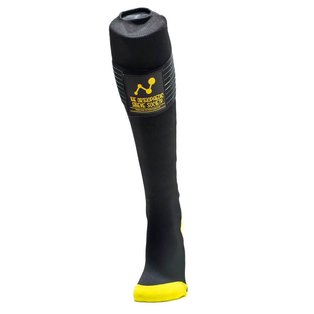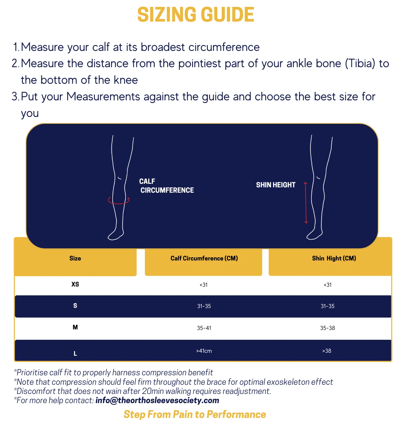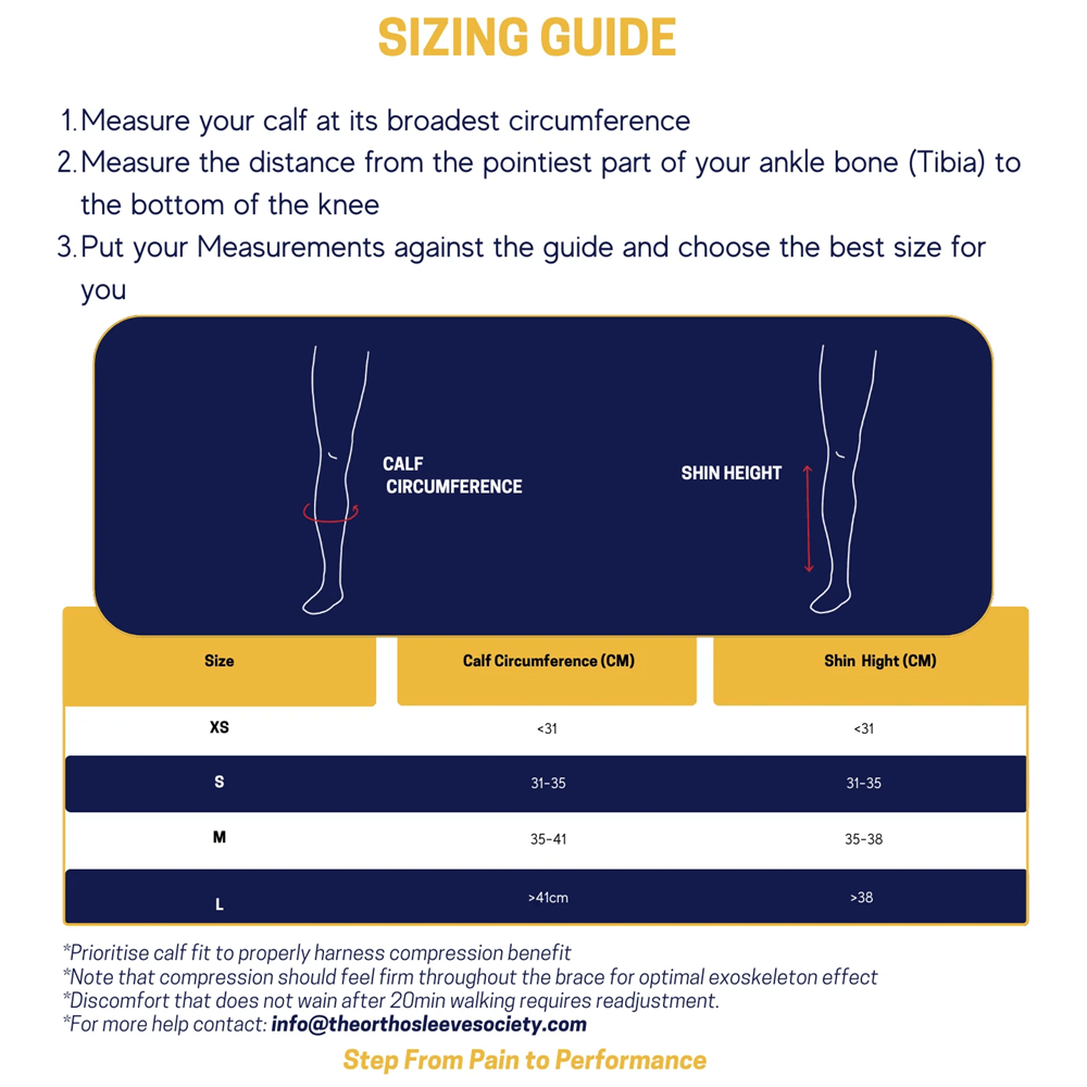 An easy to use compression style high-sock brace. With a deliberately unique design, customisable through a turn to tighten dial mechanism, this brace allows for easy and immediate adjustments to cater to all levels of pain.